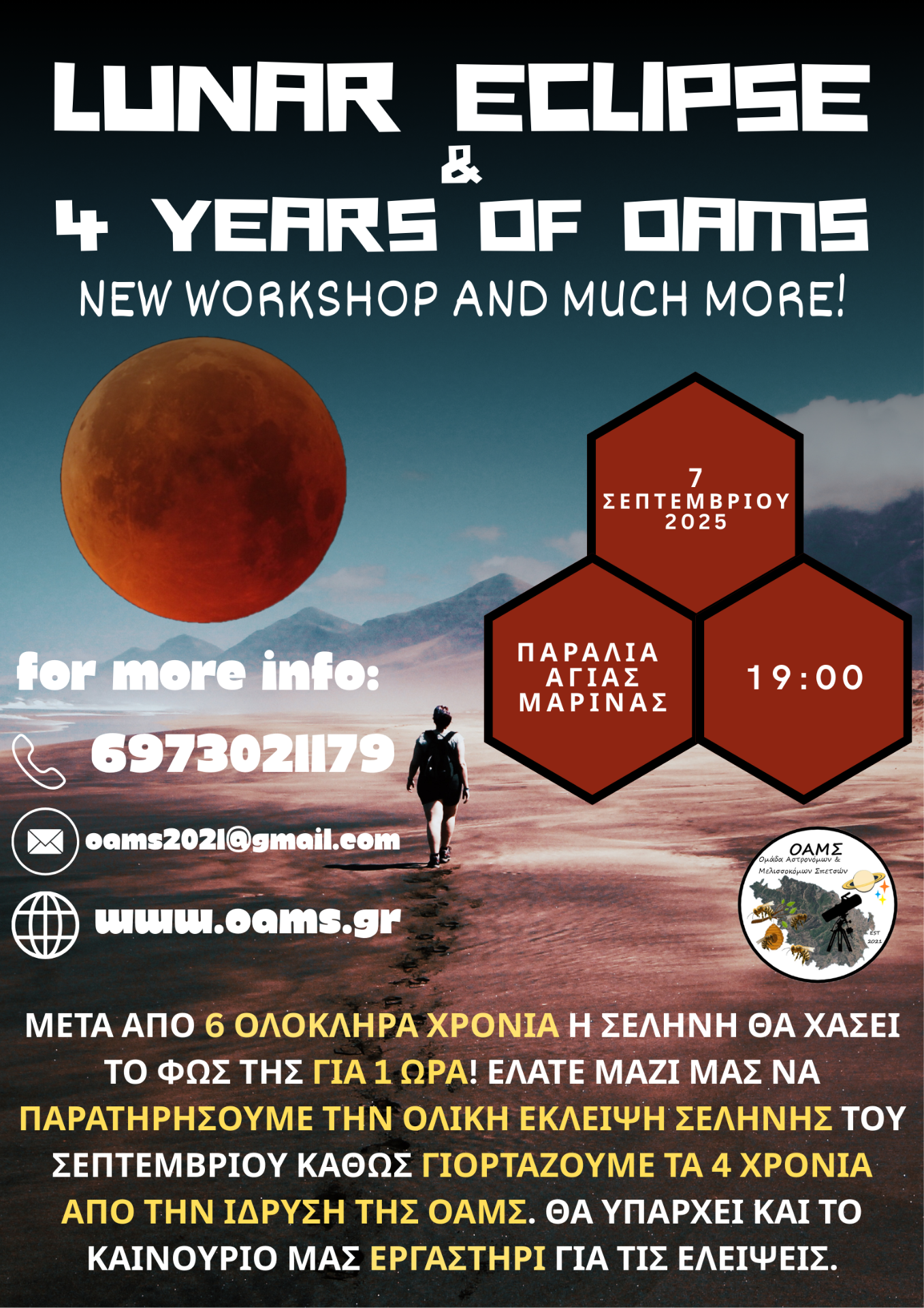 Η ΟΑΜΣ σας προσκαλεί σε μια μοναδική βραδιά γεμάτη μαγεία και επιστήμη κάτω από το φεγγάρι! Στην παραλία της Αγίας Μαρίνας, στα water sports του Μπάμπη, στις 7 Σεπτεμβρίου 2025, ώρα 19:00, ελάτε να γιορτάσουμε τα τέσσερα χρόνια της ΟΑΜΣ και την πρώτη Έκλειψη Σελήνης που θα είναι ορατή από την Ελλάδα μετά από έξι χρόνια.